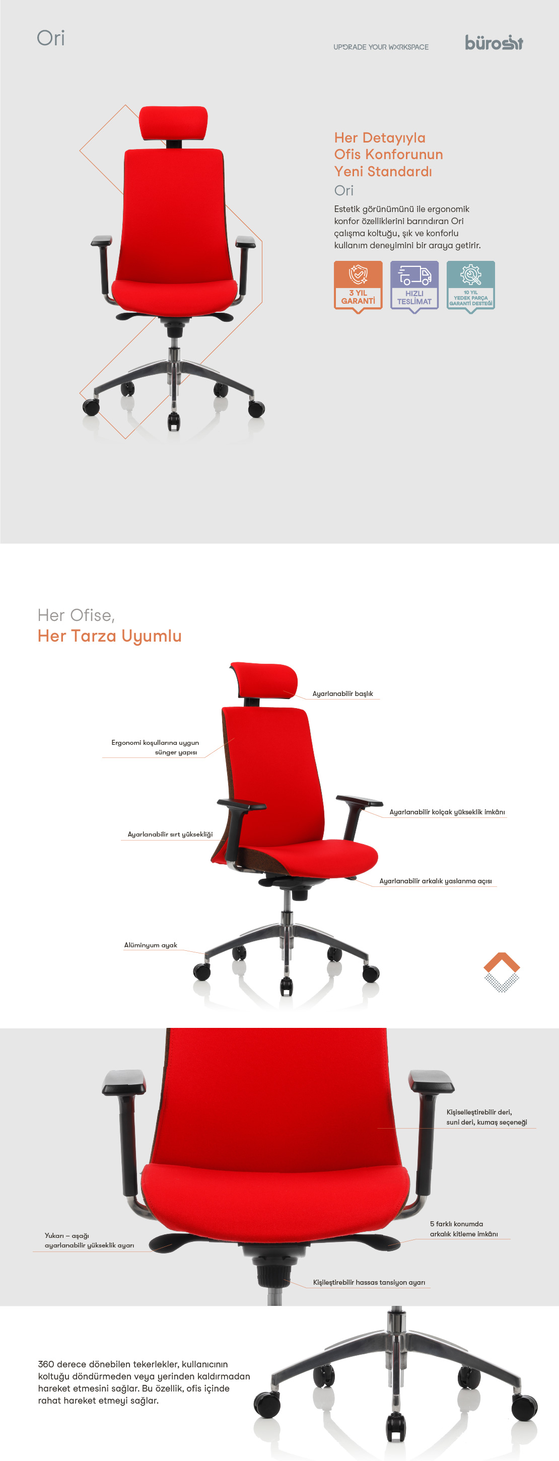 Bürosit Ar-Ge Merkezi’nde yıllardır sürdürülen ergonomi araştırmalarının sonucunda tasarlanan Ori, kişiselleştirilebilen ayar mekanizmasına sahip şık, konforlu ve kaliteli ofis koltuğudur. Ori 9 Başlıklı Yönetici Koltuğu ofise kattığı şıklık ve işlevsellik ile yönetci ve çalışanları çok memnun edecektir. Bir ofis koltuğundan beklediğiniz her şeyi size sunun Ori 9 Başlıklı ofis koltuğu ayrıyeten sade tasarım, ergonomik yapı ve Bürosit kalitesini size sunuyor. Enjeksiyon süngerden oluşan oturak ve arkalık yapısı, kullanıcının vücudunu kavrayarak şekil alıyor. Farklı vücut tiplerine sahip kullanıcılar, ayarlanabilir özellikleriyle Ori’nin ergonomik yapısından bütünüyle yararlanabiliyor.